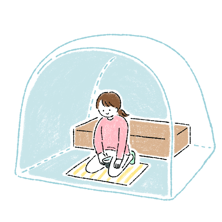 避難所用としても開発されたChiicupⓇは、床に置いて安定して使える構造。登山やキャンプ場のテント内でも、天井が低くても座位姿勢で使用できるため安心です。
